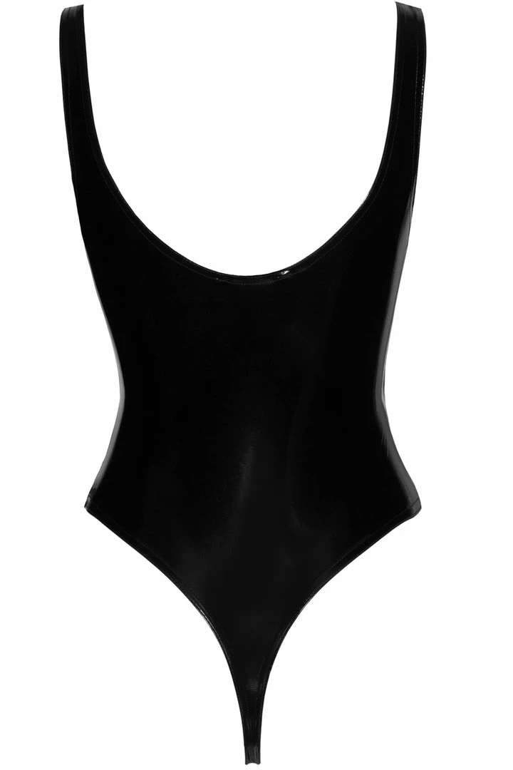 Indulge in some quinessential kink-wear with this ultra shiny PVC bodysuit from Noir Handmade. Crafted from black wetlook PVC, this sexy light-reflecting bodysuit features a scoop neckline, high leg cut and thong brief. Style yours with fishnet hold-ups for a sexy black skirt for a showstopping leather look.