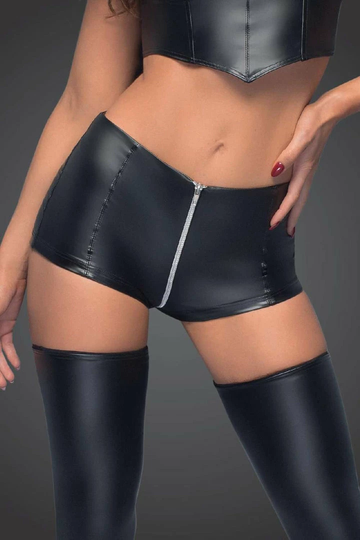 Noir Handmade combines strong designs with fetish and fashion to embrace pleasure and turn self-indulgence into empowerment. These erotic shorts are made from Powerwetlook fabric in a fitted, high-waisted silhouette to emphasize feminine curves. They feature a contrasting 2-way silver zip to the crotch, for a seductive look.
