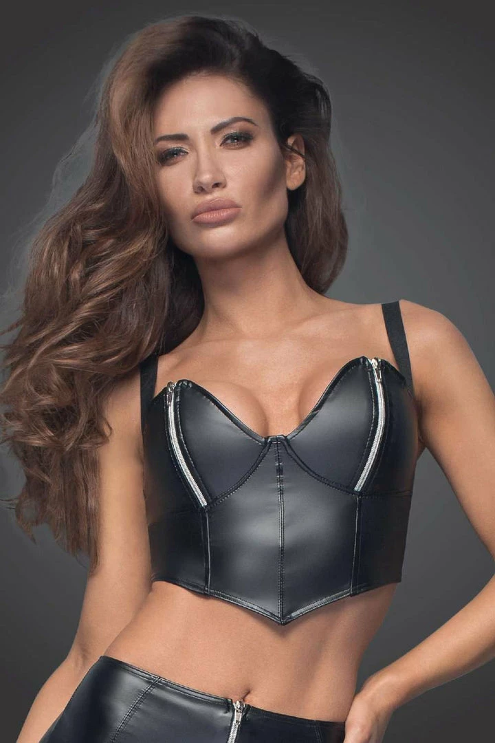 Noir Handmade inspires women to embrace pleasure, to love their body and turn self-indulgence into empowerment. This seductive crop top is cut from soft powerwetlook fabric for an alluring look. It features a slightly lowered cut in the middle and silver zippers on the bust which can be opened for naughty games. Style yours with our range of leather-look lingerie and ready-to-wear styles.