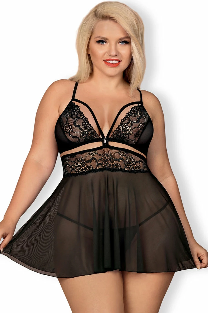 Nightwear set from Obsessive. Get pulses racing when you wear this sexy two-piece set consisting of a babydoll and mini thong. The soft sheer mesh caresses your curves beautiful whilst the lace draws attention to the bust for a tempting look.