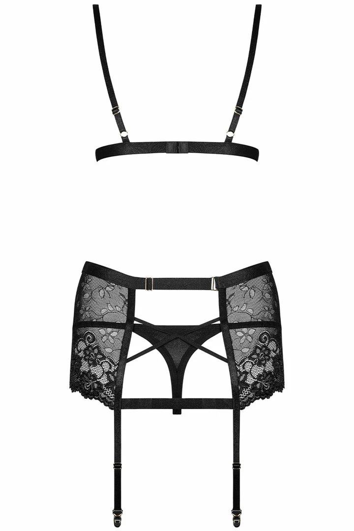 Are you curious to know what awaits you at Obsessive? Emphasized hips, lace decorations, and flirtatiously exposed buttocks – in the Blanita set you will say goodbye to boredom in your bedroom. The incredible bra cut will deliciously bring out your breasts, and the straps that decorate the garter belt will sensually highlight your back.