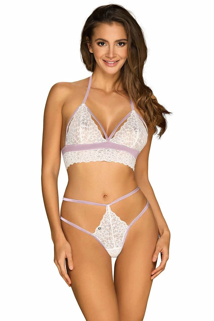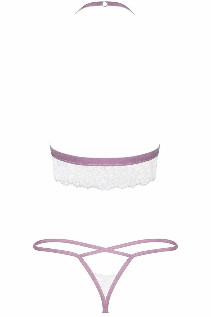 This set ignites the senses! Sensual cut, sexy straps and elegant lace, all in white combined with lilac. This translucent set will blow your mind! The beautiful shape of the breasts and a perfect fit will be guaranteed by an adjustable strap worn around the neck. The stretchable material and elastic straps will ensure great comfort.
