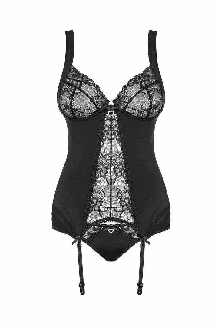 Sexy set from Obsessive. Make a show-stopping entrance in the Heartina two-piece set consisting of an underwired corset & panty. Tempting sheer lace and shiny hearts run throughout the set for a glamorous yet timeless look. Style with black stockings for a night in to remember.