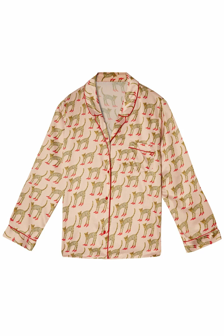 Add a touch of sass to your nightwear collection with this wild and fun long pyjama top from the Artist In Pyjamas collaboration between Kendra Dandy and Playful Promises. Crafted from silky satin with an illustrated cheetah in heels pattern, it features long sleeves, red piping, a small side pocket and button fastening through the front. Style yours with the matching pyjama pants or shorts for a truly fabulous look!