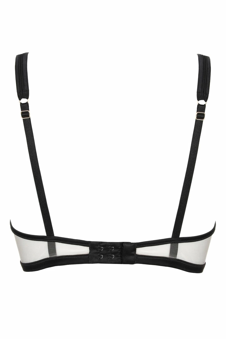 Crafted from embroidery tulle and black satin Greta push up bra features padded cups with underwires to create a rounded bust for a stunning effect. The cups feature shimmering embroidery, which creates the beautiful effect of flowers. The adjustable shoulder straps let you customise your perfect look and fit. Style yours with the matching Brazilian brief and harness.