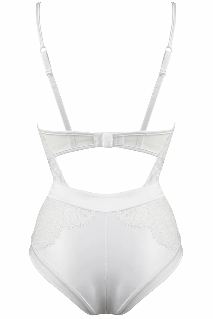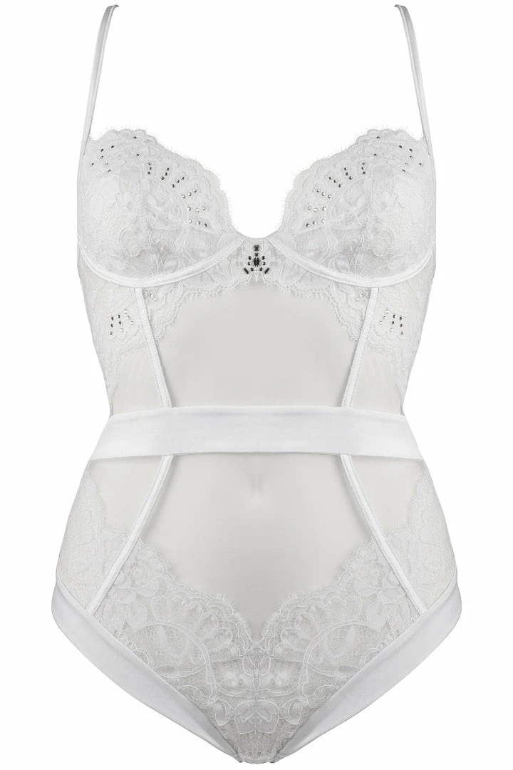 Both timeless and sexy, this white bodysuit from the Marlene collection is crafted from soft tulle, floral lace and soft silky satin to emphasise your curves to perfection. It features underwired cups, a sweetheart neckline and a brazilian brief cut. Eye-catching Swarovski Crystals sit on the front at the waist for an added touch of luxury. Style with sheer hold-ups for added sultriness!