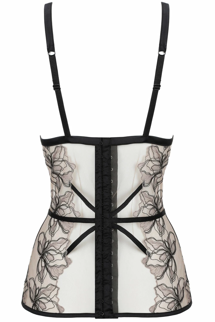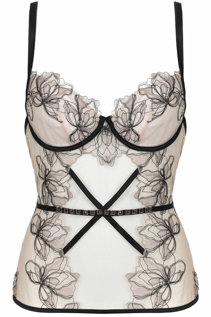 Seductive and sophisticated, this sexy basque will flaunt and flatter your figure. Crafted from sheer tulle with sparkly embroidery and black satin trim the basque feels soft against the skin. Bronze tone rhinestones sit at the centre front for a luxurious touch. The underwired cups feature bespoke, floral embroidery trims for an eye-catching look. Style with the matching Greta mini thong for added sultriness!