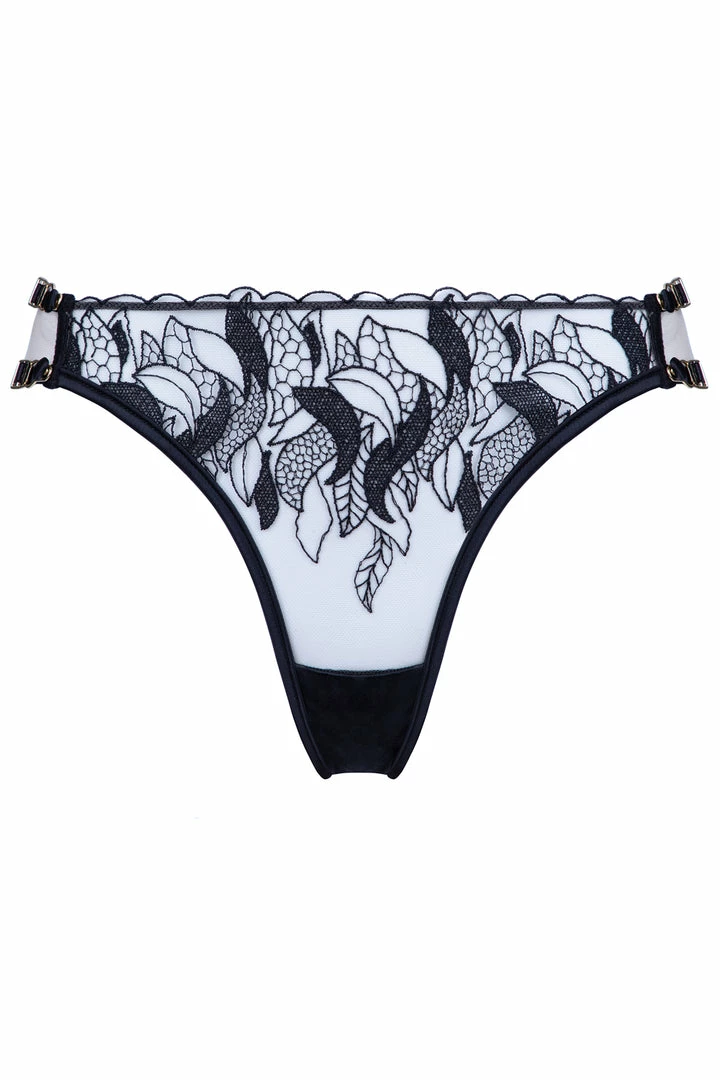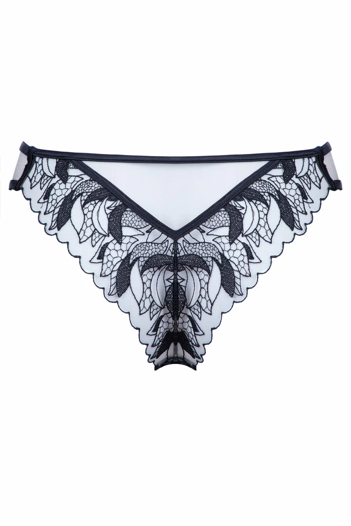 The sublime Brazilian brief from the Rita collection brings an elegant look to any woman with its striking floral embroidery on the sheer nude mesh. Its sides feature black elastic bands with decorative garter clips to highlight your hips. Style yours with the matching Push Up Bra and Harness for a timeless lingerie set you’ll treasure forever.