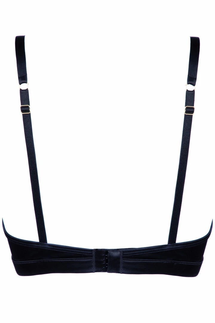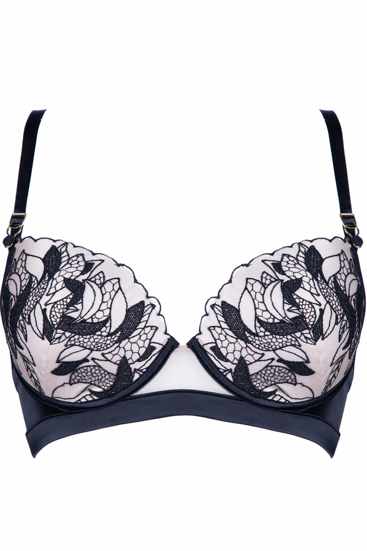 Prelude’s Rita collection is truly breathtaking. The moulded push-up bra from the line creates a plunging, secure cleavage with a rounded shape, supported by underwiring. The floral embroidered tulle cups give it a luxurious and eye-catching lustre. The soft black satin underband adds a glamourous refined touch. Pair your perfectly with sheer hold-ups and the matching Rita High Waisted Brazilian Brief.
