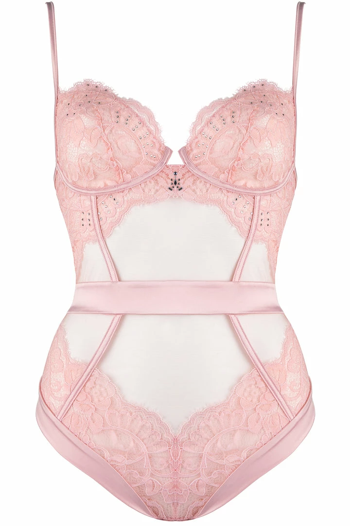 Both timeless and intoxicating, this pink bodysuit from the Marlene collection is crafted from soft tulle, floral lace and soft silky satin to emphasise your curves to perfection. It features underwired cups, a sweetheart neckline and a brazilian brief cut. Eye-catching Swarovski Crystals sit on the front at the waist for an added touch of luxury. Style with sheer hold-ups for added sultriness!