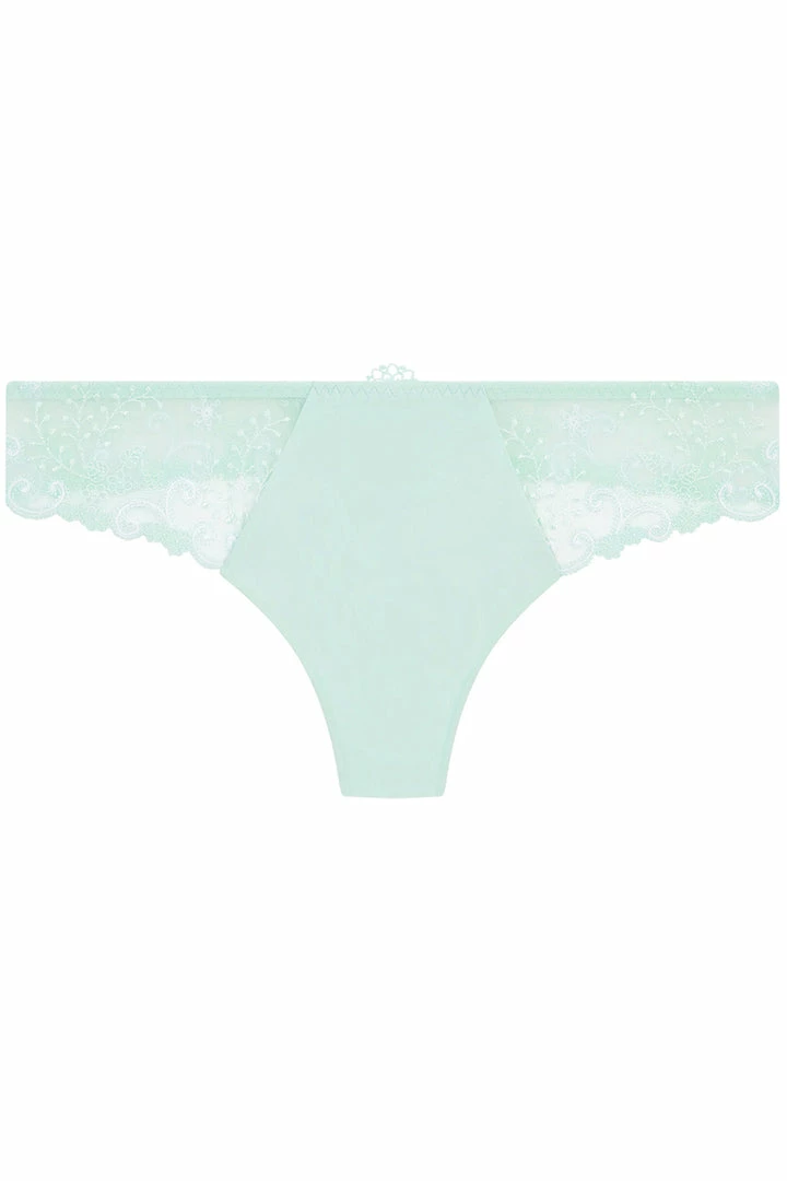 • Embroidered thong in sea green.