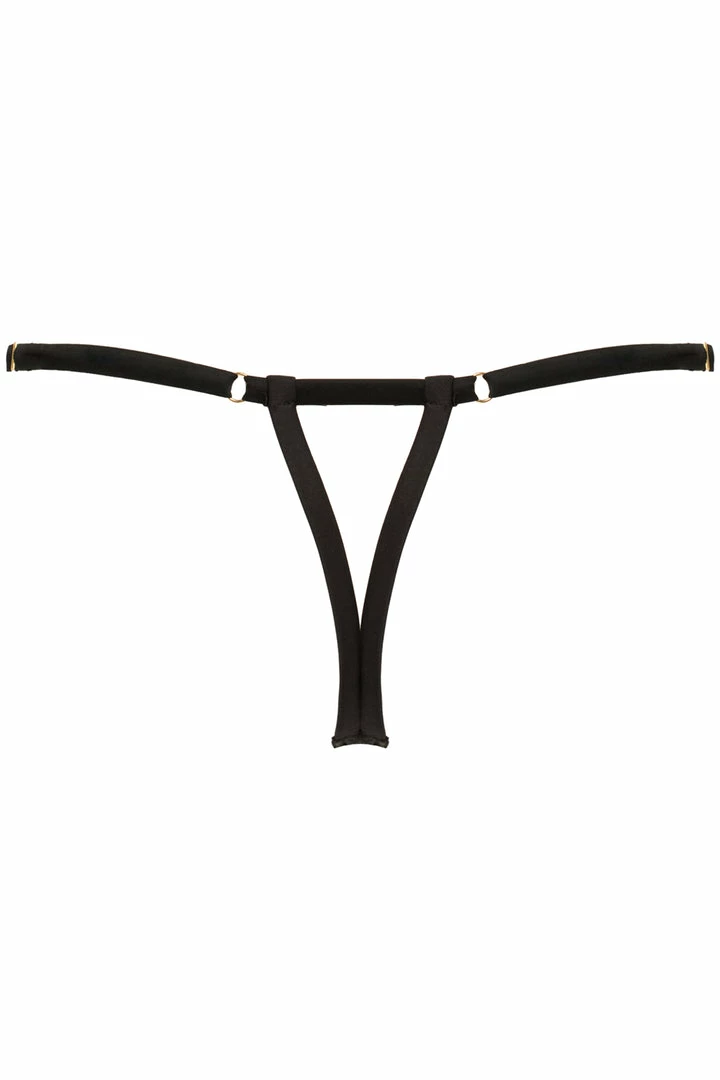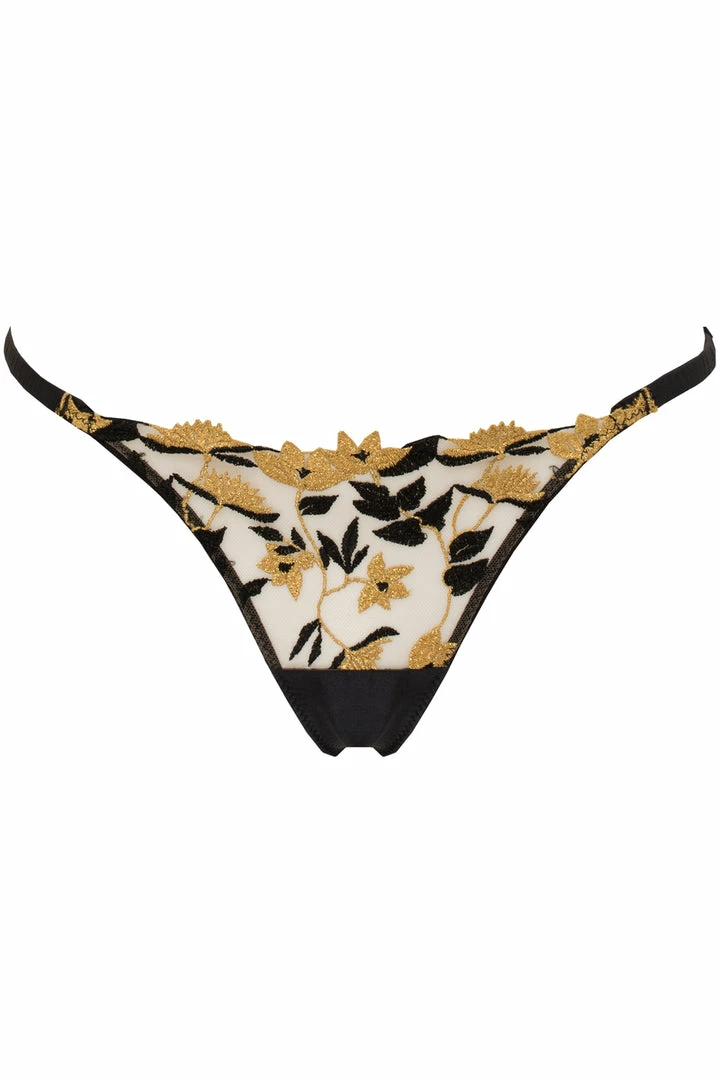 Indulge yourself with the Soraya Strap Thong from Studio Pia. Crafted from panels of bespoke embroidered tulle with a beautiful floral design, the Soraya Strap Thong frames your feminine curve to perfection. The edges are trimmed with soft jet black, cruelty-free silk satin for added luxe. The silk-wrapped side straps feature 24k gold plated adjusters for your desired fit. Complete the look with the Soraya Longline Bra and Harness Suspender for a seductive lingerie look.