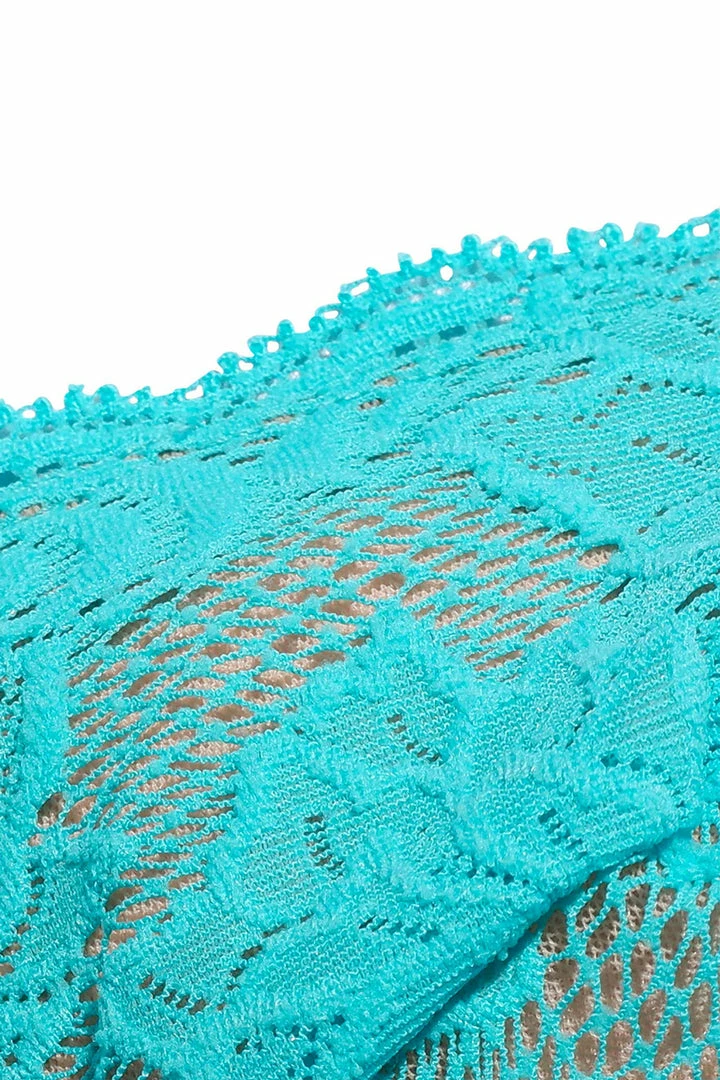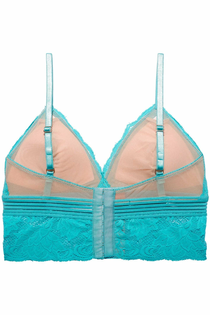 The Gilda bralette is cut from an elegant turquoise lace with scalloped edges and beige mesh lining. It has soft triangular cups with removable padding and a longline elastic underband for medium support.